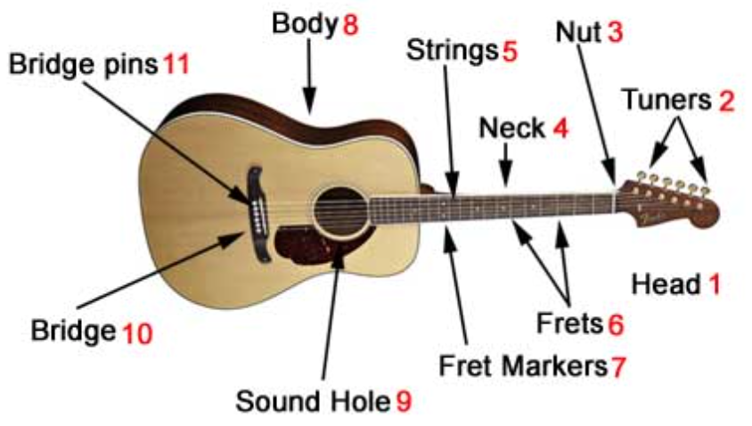 - Strings: Typically six in number, they produce sound when plucked or strummed.